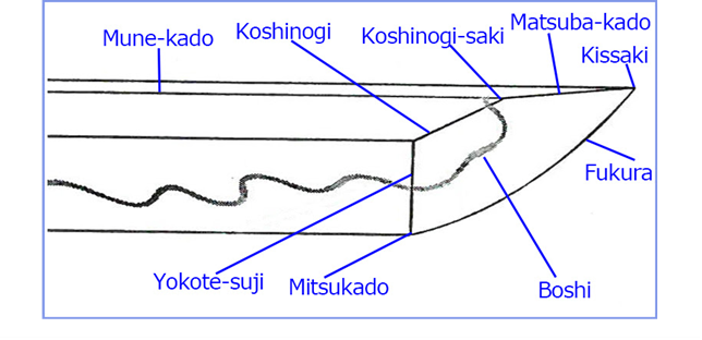 As you can see from the diagram below, there are many different parts that make up the kissaki, considering this is all in the space of a few centimetres it should give an indication as to how revered the kissaki was. From these many parts the fukura and boshi were particularly singled out by both craftsmen, appraisers and collectors.
